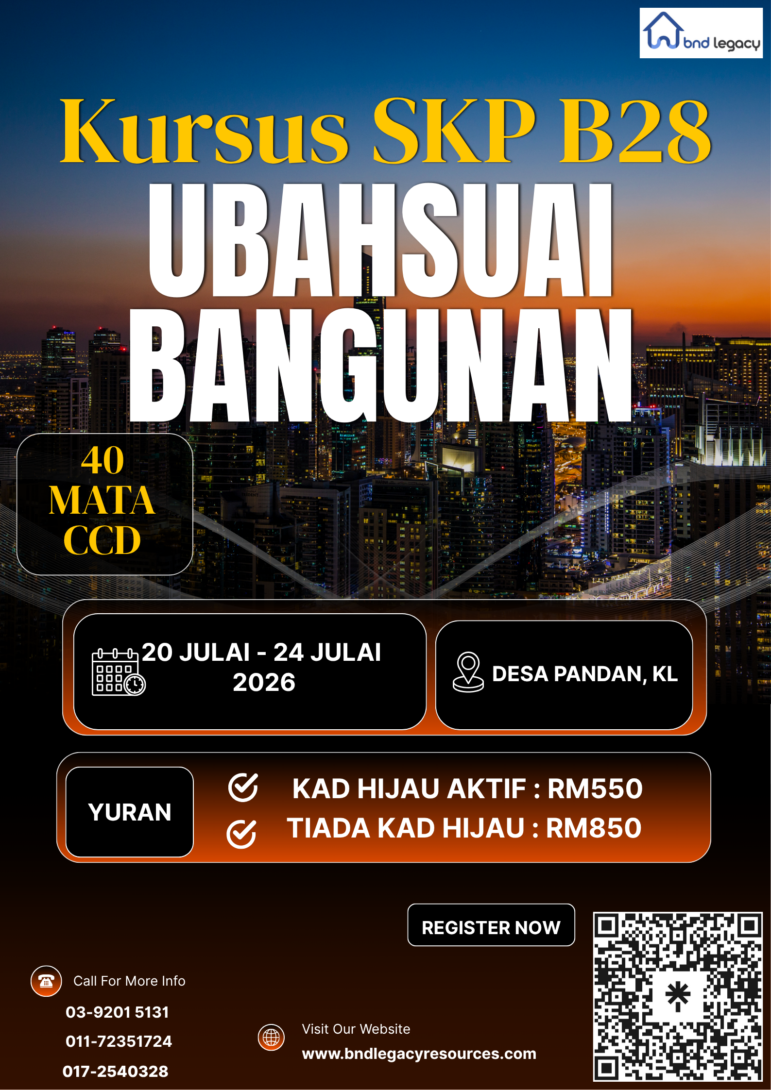𝐊𝐄𝐑𝐉𝐀 𝐁𝐀𝐍𝐆𝐔𝐍𝐀𝐍 𝐏𝐄𝐍𝐆𝐔𝐁𝐀𝐇𝐒𝐔𝐀𝐈𝐀𝐍 𝐁𝟐𝟖 – 20 Julai – 24 Julai 𝟐𝟎𝟐𝟔 (𝟒𝟎 𝐌𝐀𝐓𝐀 𝐂𝐂𝐃) RM550.00 30 in stock 𝐊𝐄𝐑𝐉𝐀 𝐁𝐀𝐍𝐆𝐔𝐍𝐀𝐍 𝐏𝐄𝐍𝐆𝐔𝐁𝐀𝐇𝐒𝐔𝐀𝐈𝐀𝐍 𝐁𝟐𝟖 - 20 Julai - 24 Julai 𝟐𝟎𝟐𝟔 (𝟒𝟎 𝐌𝐀𝐓𝐀 𝐂𝐂𝐃) quantity Add to cart Categories: 40 MATA CCD, B28, KERJA PENGUBAHSUAIAN, KURSUS KOD BIDANG, KURSUS TAMBAH KOD BIDANG, KURSUSKODBIDANG Description Description 𝐊𝐔𝐑𝐒𝐔𝐒 𝐊𝐎𝐃 𝐁𝐈𝐃𝐀𝐍𝐆 𝐁𝟐𝟖: 𝐊𝐄𝐑𝐉𝐀 𝐁𝐀𝐍𝐆𝐔𝐍𝐀𝐍 𝐏𝐄𝐍𝐆𝐔𝐁𝐀𝐇𝐒𝐔𝐀𝐈𝐀𝐍 . 𝐓𝐚𝐫𝐢𝐤𝐡: 𝟐0 – 24 Julai 𝟐𝟎𝟐𝟔 𝐋𝐨𝐤𝐚𝐬𝐢: 𝐃𝐞𝐬𝐚 𝐏𝐚𝐧𝐝𝐚𝐧, 𝐊𝐮𝐚𝐥𝐚 𝐋𝐮𝐦𝐩𝐮𝐫 𝐘𝐮𝐫𝐚𝐧 𝐊𝐮𝐫𝐬𝐮𝐬: 𝐑𝐌𝟓𝟓𝟎 (𝐏𝐞𝐦𝐞𝐠𝐚𝐧𝐠 𝐊𝐚𝐝 𝐇𝐢𝐣𝐚𝐮) 𝐑𝐌𝟖𝟓𝟎 (𝐓𝐢𝐚𝐝𝐚 𝐊𝐚𝐝 𝐇𝐢𝐣𝐚𝐮) 𝟒𝟎 𝐌𝐚𝐭𝐚 𝐂𝐂𝐃 . 𝐒𝐢𝐚𝐩𝐚 𝐲𝐚𝐧𝐠 𝐩𝐚𝐭𝐮𝐭 𝐡𝐚𝐝𝐢𝐫? Kontraktor kerja-kerja bangunan yang buat pengubahsuaian atau tambahan bangunan. Kontraktor yang nak tambah pengetahuan dan kumpul mata CCD. Sesiapa yang nak masuk industri pembinaan dengan kemahiran kerja bangunan asas. . 𝐀𝐩𝐚 𝐢𝐥𝐦𝐮 𝐲𝐚𝐧𝐠 𝐚𝐧𝐝𝐚 𝐚𝐤𝐚𝐧 𝐝𝐚𝐩𝐚𝐭? Asas kerja-kerja pengubahsuaian bangunan dan struktur binaan. Teknik dan kaedah kerja mengikut spesifikasi keselamatan CIDB. Penyediaan dokumen projek kecil-kecilan. Pemahaman berkaitan undang-undang dan keperluan teknikal kerja ubahsuai. Tips dan amalan terbaik di tapak binaan. . 𝐃𝐚𝐟𝐭𝐚𝐫 𝐬𝐞𝐤𝐚𝐫𝐚𝐧𝐠! 𝐈𝐦𝐛𝐚𝐬 𝐐𝐑 𝐂𝐨𝐝𝐞 𝐚𝐭𝐚𝐮 𝐥𝐚𝐲𝐚𝐫𝐢: . https://linktr.ee/bndlegacy . 𝐰𝐰𝐰.𝐛𝐧𝐝𝐥𝐞𝐠𝐚𝐜𝐲𝐫𝐞𝐬𝐨𝐮𝐫𝐜𝐞𝐬.𝐜𝐨𝐦 . #UbahsuaiBangunan #KodB28 #BNDLegacy #CIDB #KursusSKP Related products 📣𝐊𝐔𝐑𝐒𝐔𝐒 𝐊𝐎𝐃 𝐁𝐈𝐃𝐀𝐍𝐆: 𝐒𝐈𝐒𝐓𝐄𝐌 𝐁𝐄𝐊𝐀𝐋𝐀𝐍 𝐀𝐈𝐑 (𝐂𝐄𝟐𝟎) 𝟐𝟎 𝐀𝐩𝐫𝐢𝐥 – 𝟐𝟒 𝐀𝐩𝐫𝐢𝐥 𝟐𝟎𝟐𝟔 (𝟰𝟬 𝗠𝗔𝗧𝗔 𝗖𝗖𝗗)📣 RM550.00 Read more 𝐊𝐔𝐑𝐒𝐔𝐒 𝐓𝐀𝐌𝐁𝐀𝐇 𝐊𝐎𝐃 𝐁𝐈𝐃𝐀𝐍𝐆 (𝐁𝟐𝟒) – 𝐊𝐄𝐑𝐉𝐀 𝐁𝐀𝐍𝐆𝐔𝐍𝐀𝐍 – 𝐊𝐄𝐑𝐉𝐀 𝐏𝐄𝐍𝐘𝐄𝐍𝐆𝐆𝐀𝐑𝐀𝐀𝐍 𝐃𝐀𝐍 𝐏𝐄𝐑𝐒𝐄𝐊𝐈𝐓𝐀𝐑𝐀𝐍 𝐊𝐎𝐌𝐏𝐋𝐄𝐊𝐒 (𝐊𝐊-𝐓-𝟎𝟑𝟕) 11 MEI – 15 MEI 2026 RM550.00 Add to cart 📣𝗞𝗨𝗥𝗦𝗨𝗦 𝗧𝗔𝗠𝗕𝗔𝗛 𝗞𝗢𝗗 𝗕𝗜𝗗𝗔𝗡𝗚 𝐒𝐈𝐒𝐓𝐄𝐌 𝐏𝐄𝐍𝐘𝐀𝐌𝐀𝐍 𝐔𝐃𝐀𝐑𝐀 & 𝐏𝐄𝐍𝐆𝐄𝐃𝐀𝐑𝐀𝐍 𝐔𝐃𝐀𝐑𝐀 (𝐌𝟎𝟏) 18 MEI – 22 MEI 𝟐𝟎𝟐𝟔 (𝟰𝟬 𝗠𝗔𝗧𝗔 𝗖𝗖𝗗) RM550.00 Add to cart 𝐊𝐔𝐑𝐒𝐔𝐒 𝐓𝐀𝐌𝐁𝐀𝐇 𝐊𝐎𝐃 𝐁𝐈𝐃𝐀𝐍𝐆 (E02) – SISTEM PENGAWASAN & KESELAMATAN BANGUNAN (8 – 12 JUN 2026) RM550.00 Add to cart Utama Pengenalan Galeri Events Perkhidmatan Servis Pendaftaran Dan Pembaharuan Lesen CIDB Menganjurkan Kursus Kontraktor Tambah Bidang dan Mata CCD CIDB Khidmat Nasihat Berkaitan Perlesenan CIDB Khidmat Sewa Bilik Seminar & Bilik Mesyuarat Kursus & Latihan Akaun Saya Cart Orders Checkout My account Account details Lost password Info Kontraktor Hubungi Kami Pertanyaan Maklum Balas Memerlukan Bantuan Kami? Pihak kami bersedia membantu anda. Hubungi Kami Twitter Facebook Instagram Youtube RSS